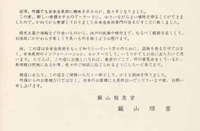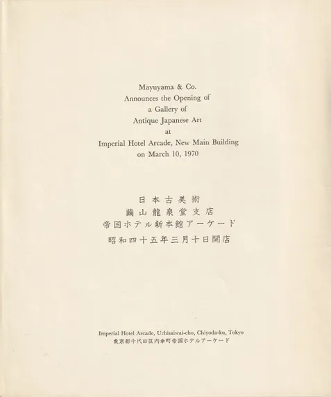 「ライト館」時代が終わり、現在の3代目本館が営業を開始した1970年、56歳の繭山順吉は新しい帝国ホテルアーケードに日本古美術店を開きました。開店の挨拶文には日本の鑑賞美術のインフォメーションセンターとして利用を呼びかけています。